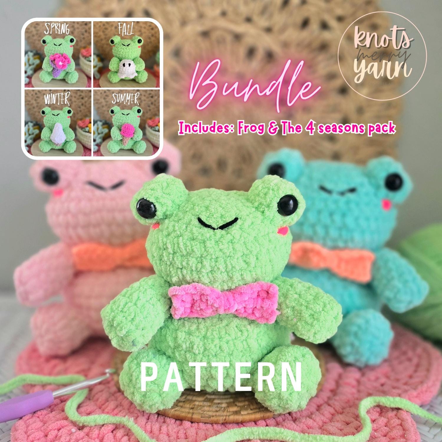 Meet the cutest frog on the block—ready for every season! 🐸 This beginner-friendly crochet pattern includes instructions to make your own plush frog plus four festive accessories that celebrate the seasons in style: